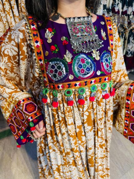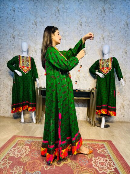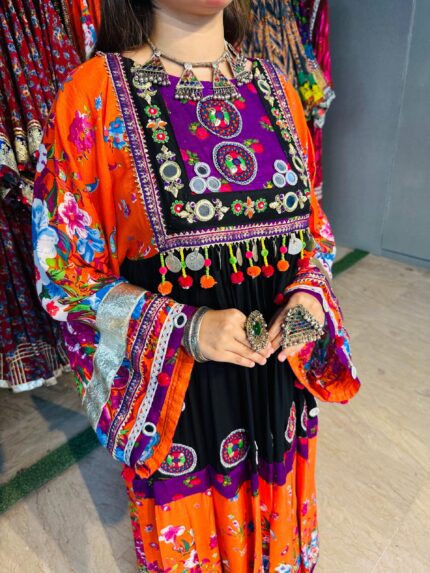 A stunning long chiffon sequins frock intricately embellished with Sindhi detailing and elegant side slits, giving it a graceful festive look. This outfit is paired with a same-shade grip pant and a multicolor chiffon dupatta, creating a perfect luxury ensemble for Eid and special occasions.