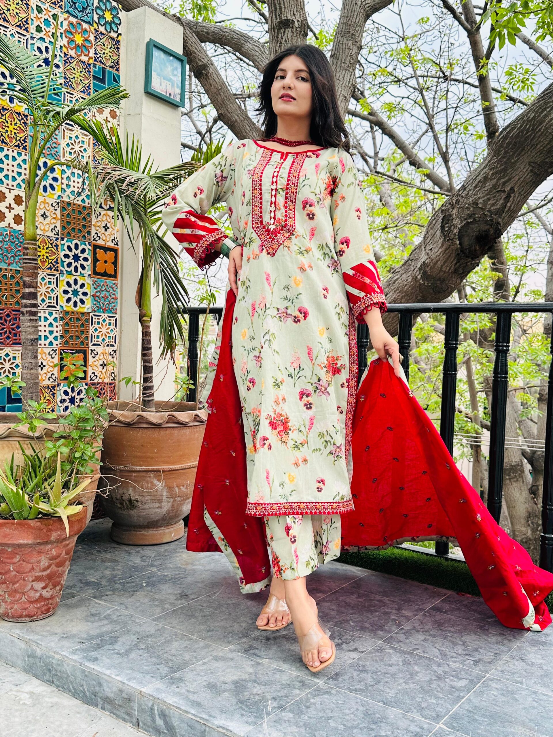 Elevate your festive look with this stunning 3-piece embroidered ensemble, crafted from premium printed lawn for a perfect blend of comfort and elegance.