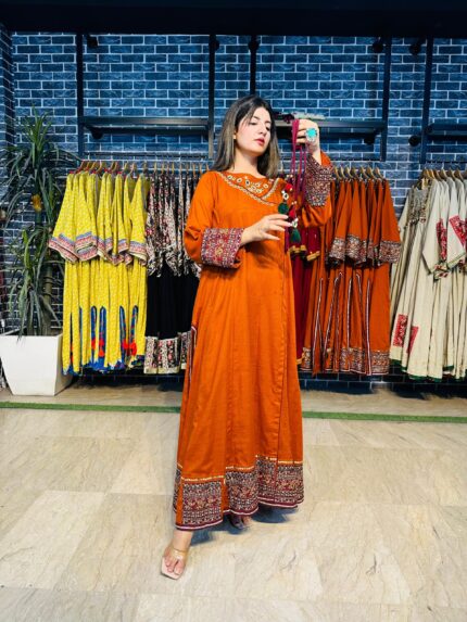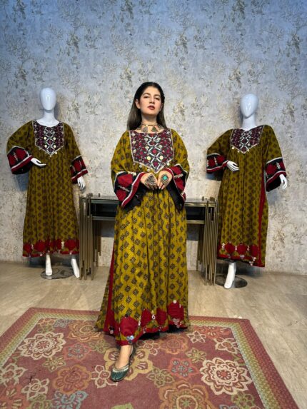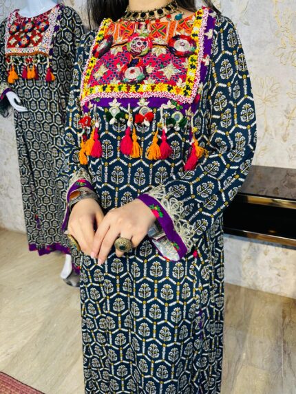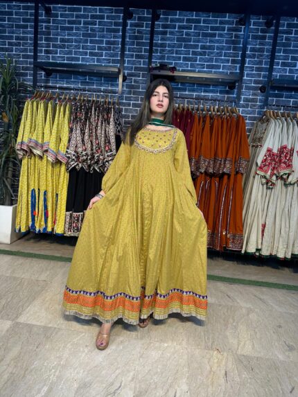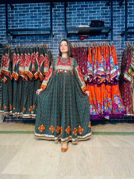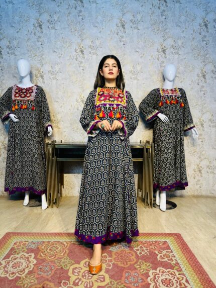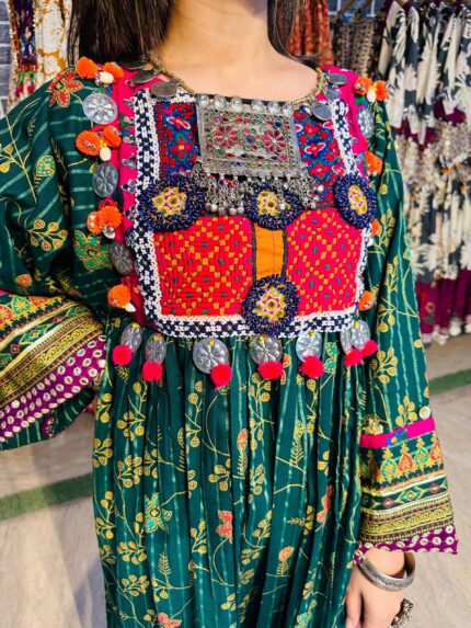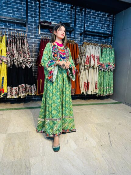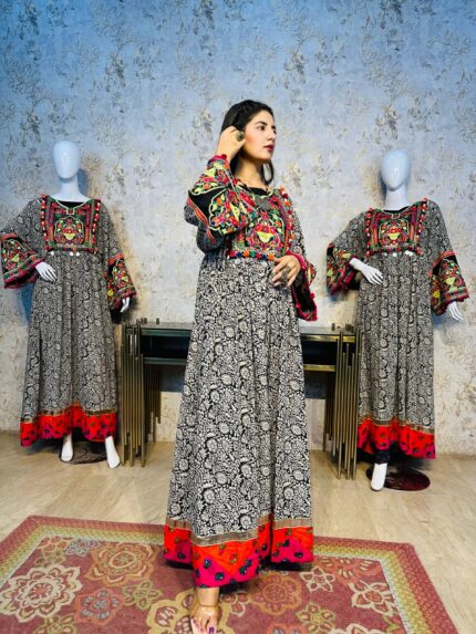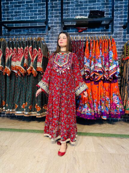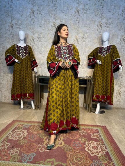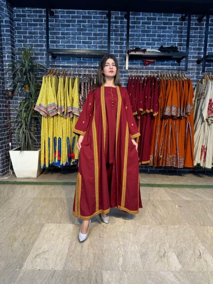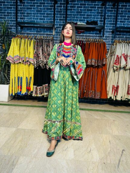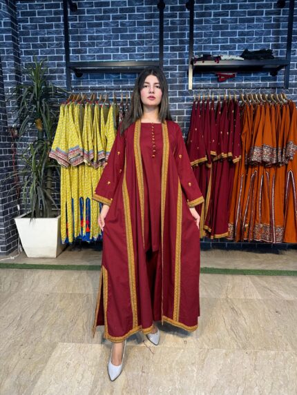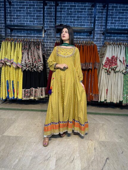 A stunning long chiffon sequins frock intricately embellished with Sindhi detailing and elegant side slits, giving it a graceful festive look. This outfit is paired with a same-shade grip pant and a multicolor chiffon dupatta, creating a perfect luxury ensemble for Eid and special occasions.